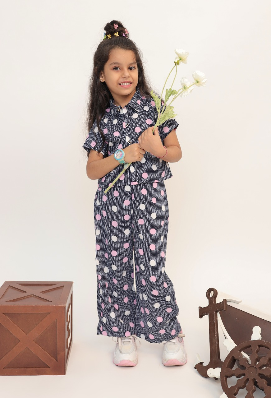The Black-Pink Crop Shirt and Palazzo Co-Ord Set is a fashionable and fun combination. The outfit includes matching palazzo pants and a black crop top with pink and white polka-dot patterns. Made from soft, breathable cotton, it is comfortable and easy to move in, making it perfect for playdates or everyday wear.