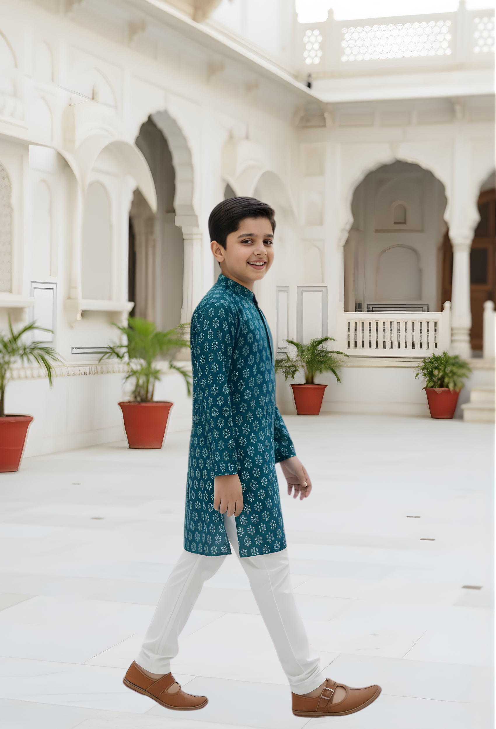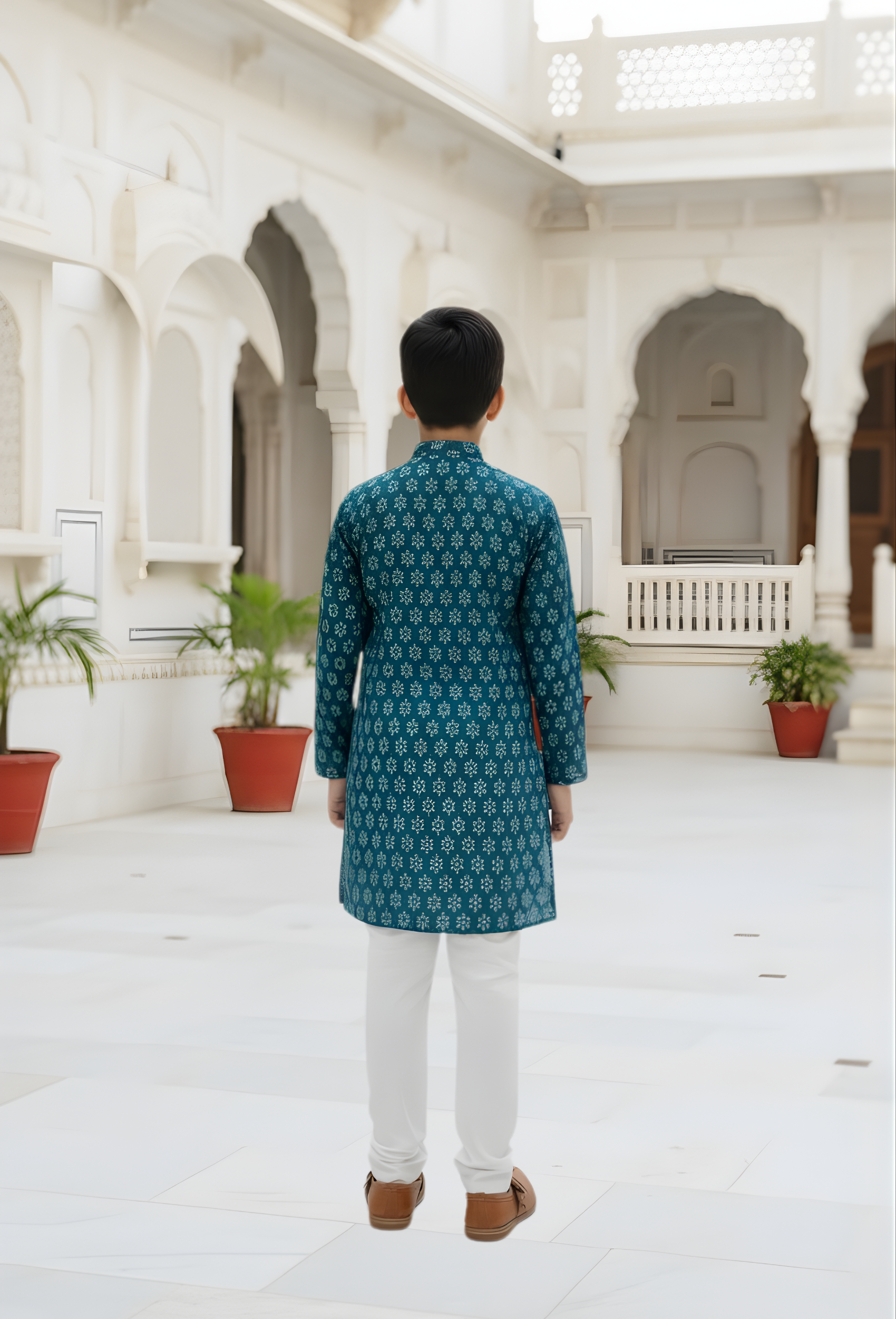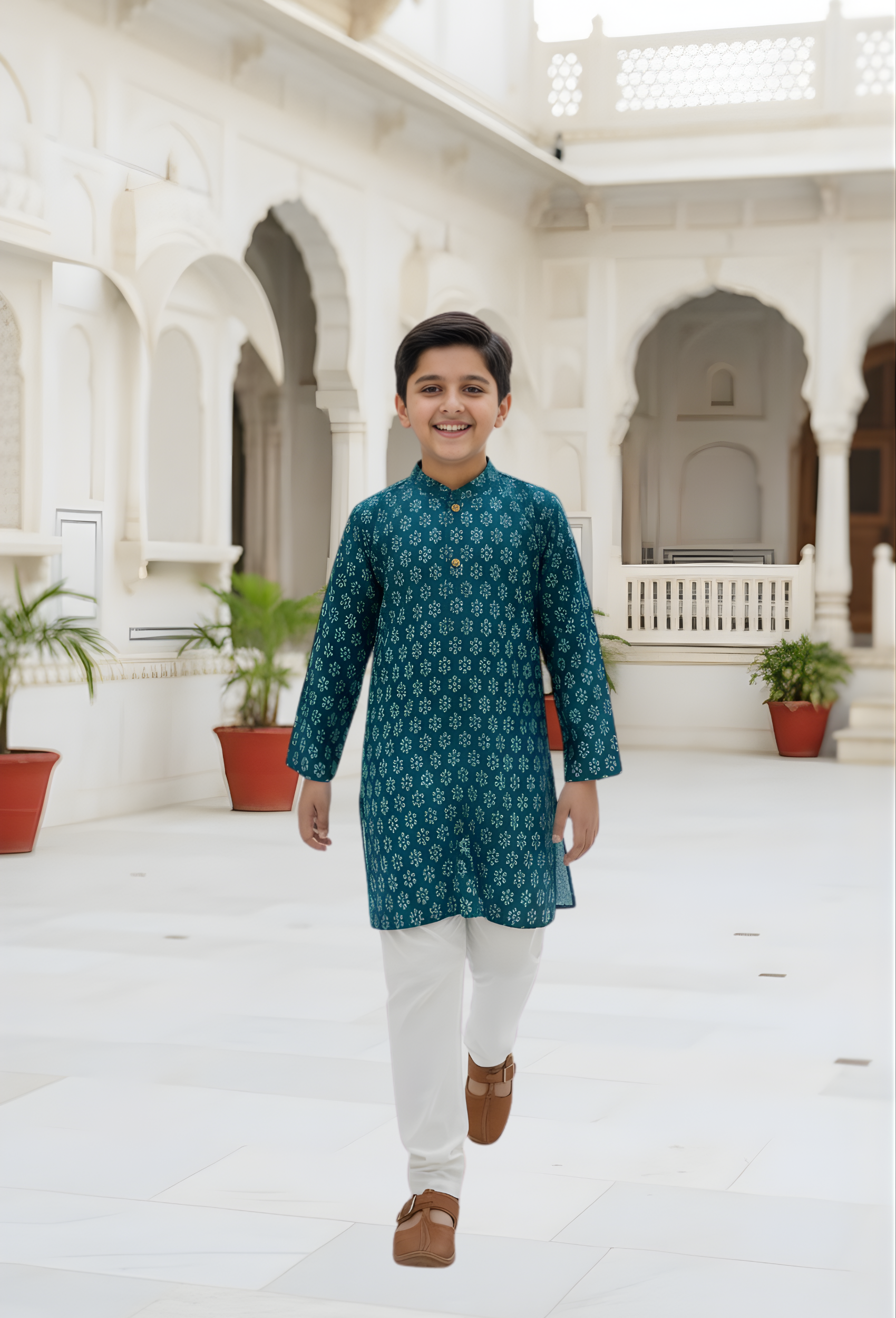 This blue kurta pajama set offers a bright, traditional look with everyday comfort. Crafted from smooth cotton, it keeps kids relaxed whether they are playing or attending a special event. A great choice for functions and celebrations.