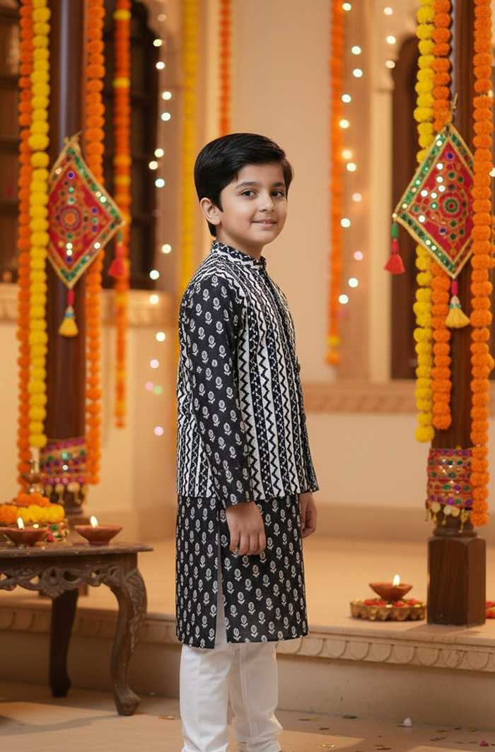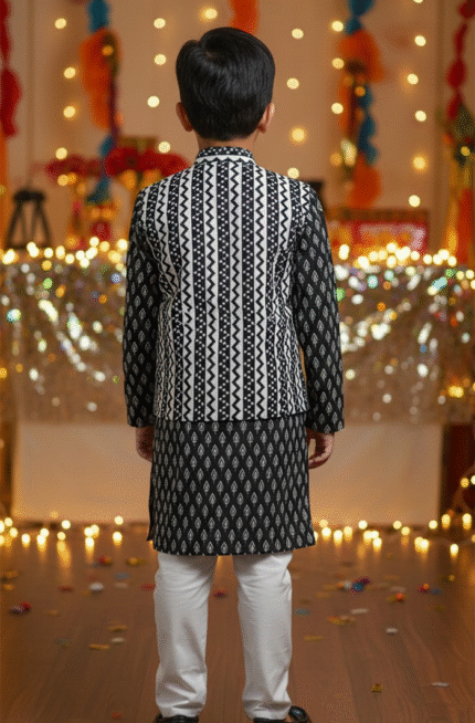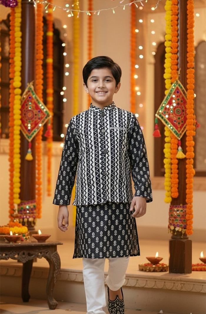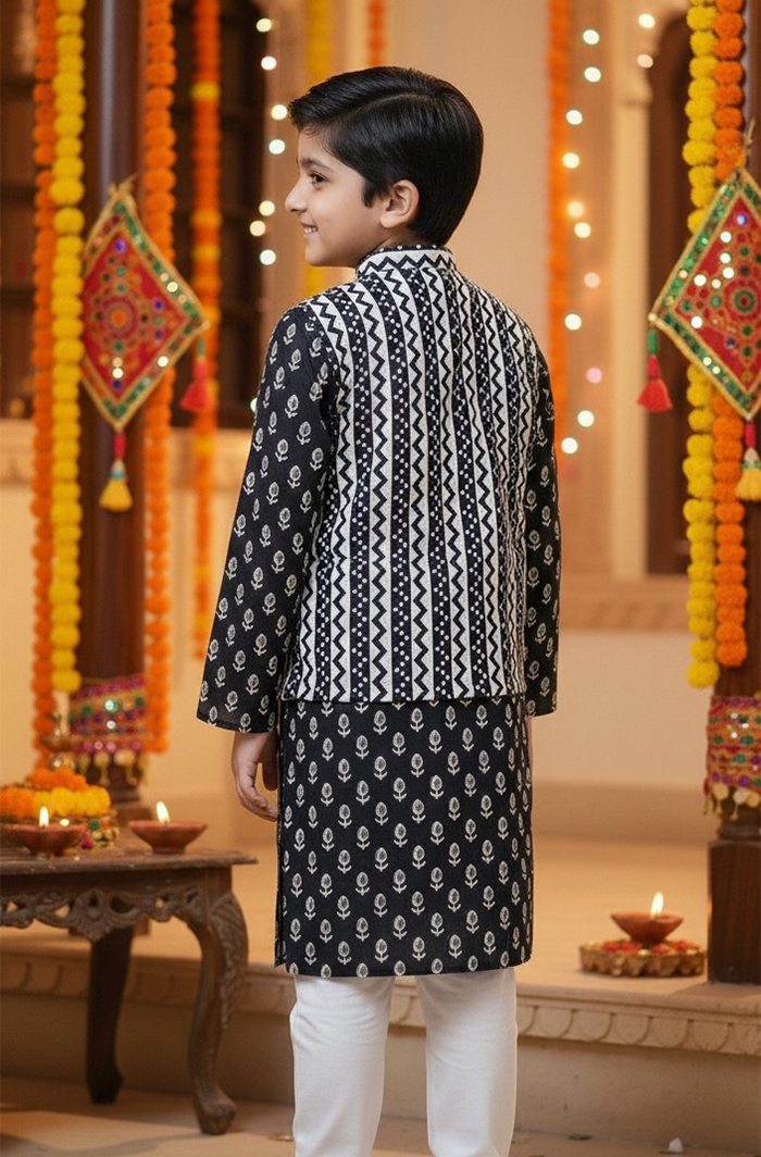 Give your child a sharp ethnic look with this Boy Kurta Pajama Jacket Set in Black, crafted from 100% pure cotton for all-day comfort. The elegant black printed kurta paired with a contrasting ethnic jacket and classic pajama creates a timeless festive outfit that’s both stylish and easy to wear.