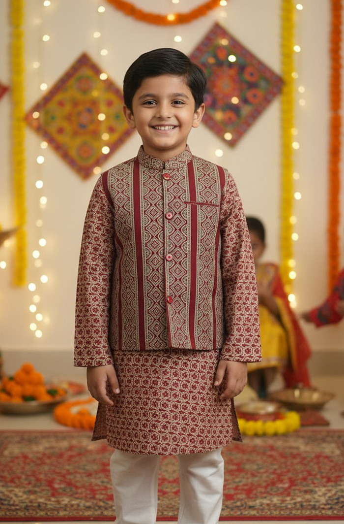 Add timeless festive elegance to your child’s wardrobe with this Boy Kurta Pajama Jacket Set, crafted from 100% pure cotton for comfort and breathability. Featuring a rich maroon printed kurta paired with a matching ethnic jacket and classic pajama, this set offers a perfect blend of traditional charm and easy wear for special occasions.