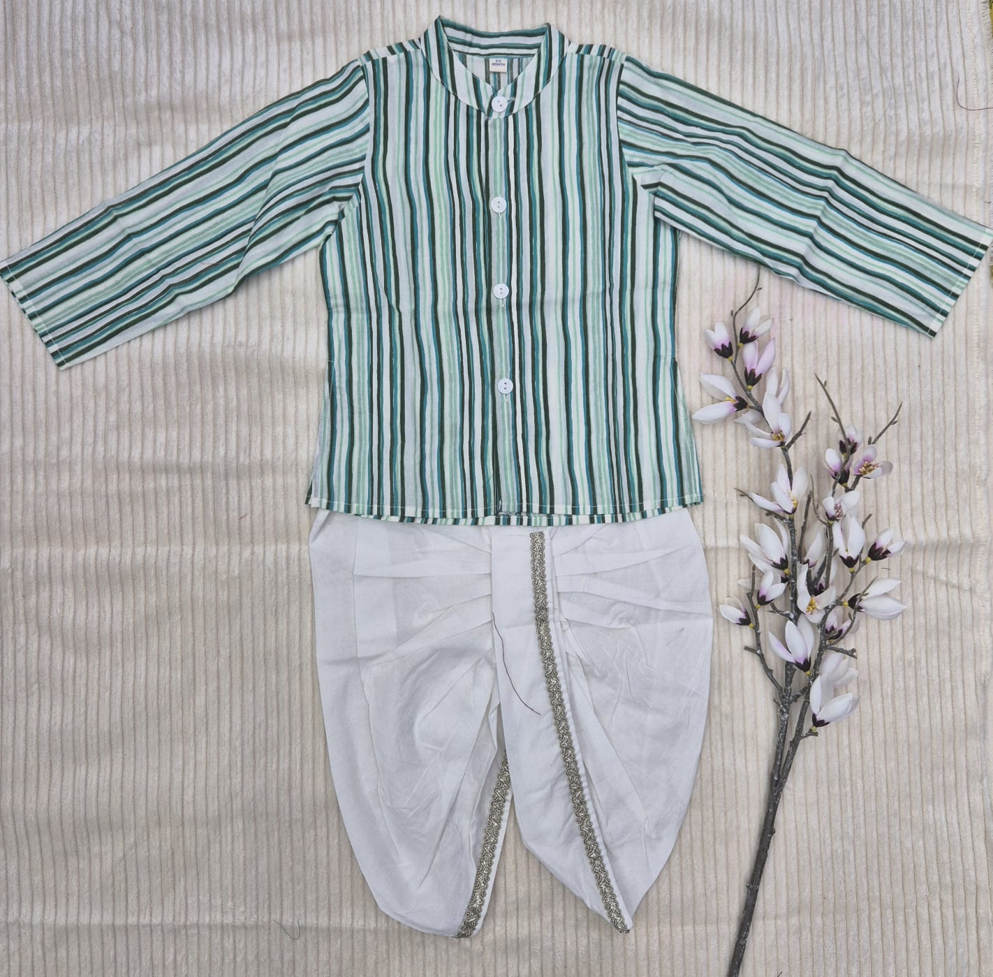 This adorable Green cotton kurta set is perfect for your little one, designed for boys aged 6-12 months or 1-2 years. Made from high-quality Cotton 60*60 fabric, this set provides both comfort and style. Ideal for festive occasions, family gatherings, or casual wear, it ensures a soft, breathable experience for your child throughout the day. The kurta is paired with matching white pants, creating a stylish traditional look for any event.