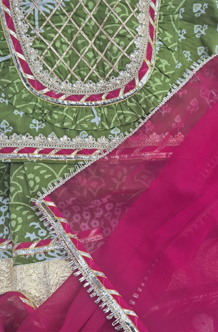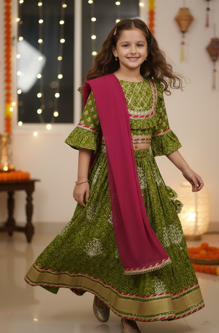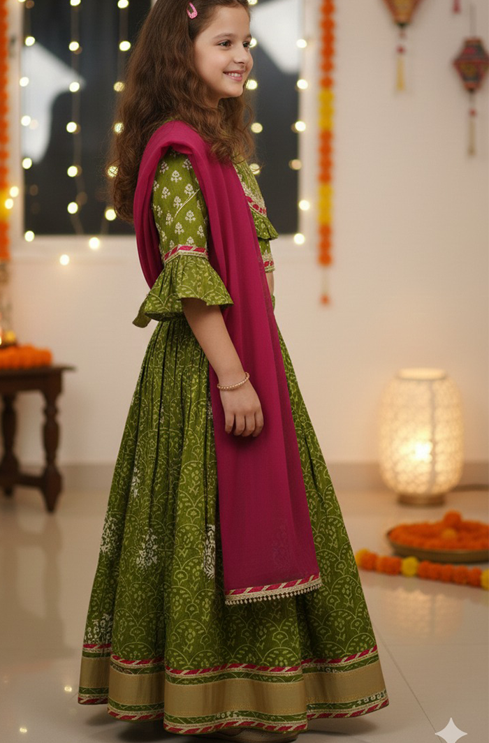 Give your little girl a fresh festive look with this Girl Cotton Ethnic Lehanga Choli Dupatta Set in Green, crafted from soft, breathable cotton for all-day comfort. The beautifully printed lehanga and choli are paired with a lightweight georgette dupatta, creating a graceful ethnic outfit that’s both stylish and easy to wear.