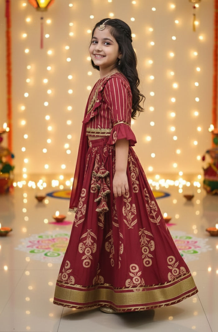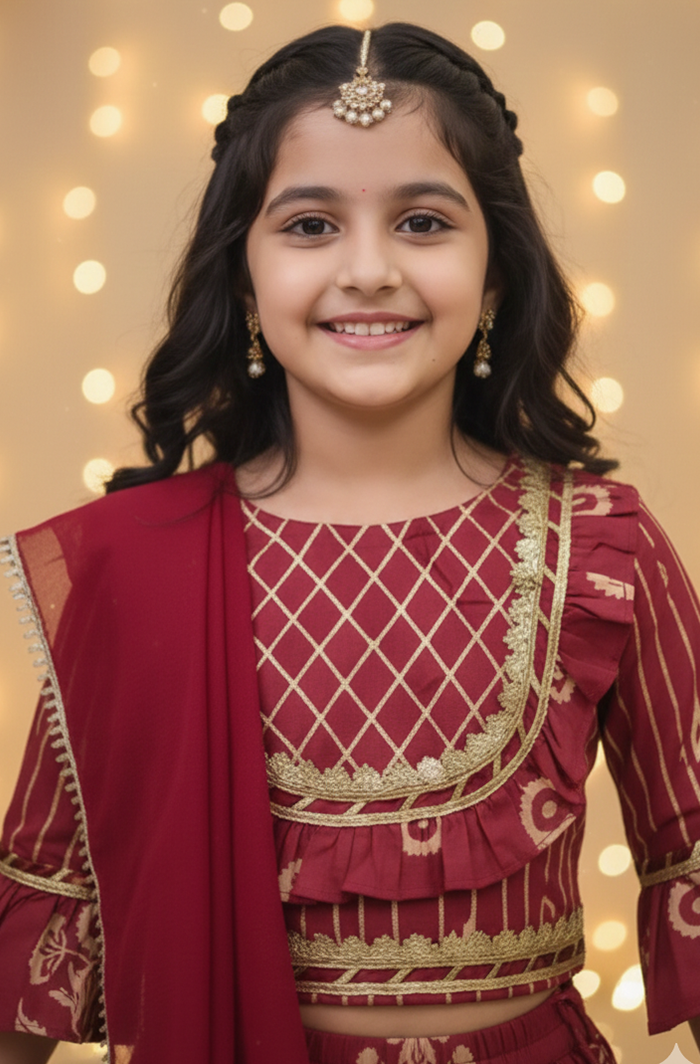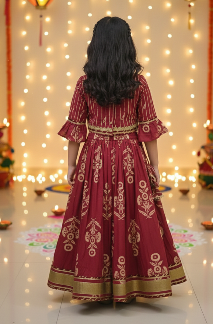 Dress your little girl in timeless festive charm with this Girl Cotton Ethnic Lehanga Choli Dupatta Set in Rust Red, crafted from soft, breathable cotton for all-day comfort. The richly printed lehanga and choli paired with a lightweight georgette dupatta create an elegant ethnic look that’s perfect for special occasions.