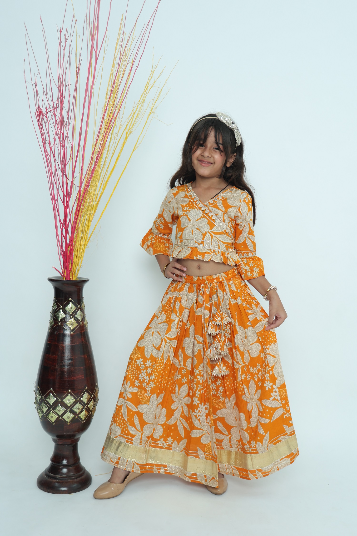 Bring sunshine to every celebration with this vibrant Girls’ Bright Floral Lehenga Choli Set in a stunning mix of orange and beige floral prints. This stylish ethnic ensemble features a crop-style choli with flared sleeves and a flowy lehenga skirt adorned with playful tassel detailing at the waist.