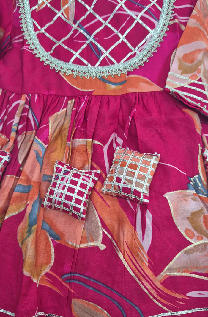 This Rani Kurti Sharara set combines traditional design with comfort. Made from soft Modal Chanderi fabric, it includes a flared Kurti with colorful embroidery and a wide-legged Sharara that moves easily. Ideal for festivals, weddings, and family gatherings.