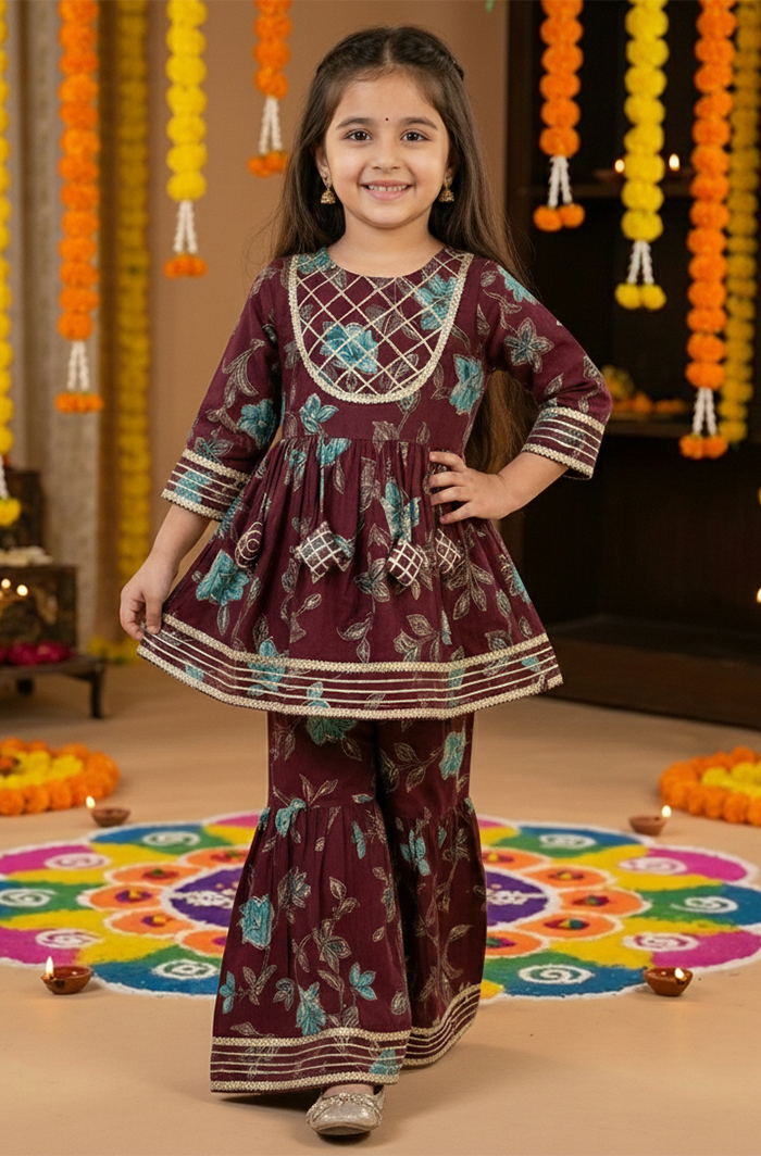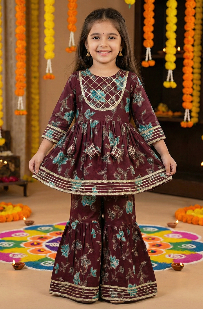 Girl’s Exquisite Voilet Color Kurti Sharara Set at Cotton Cuddle Girl’s Exquisite Voilet Color Kurti Sharara Set - Cotton Cuddle