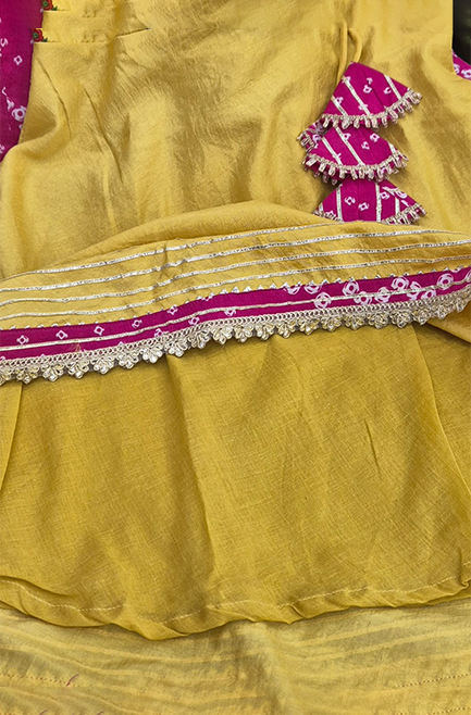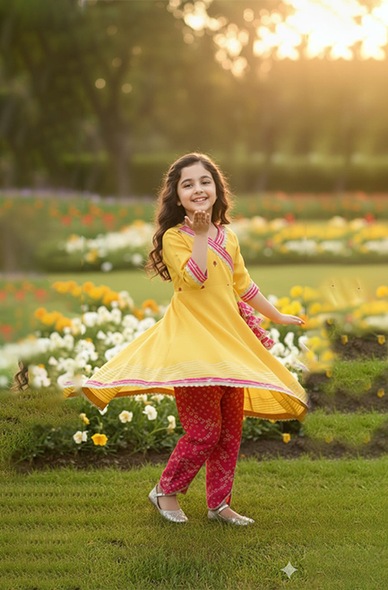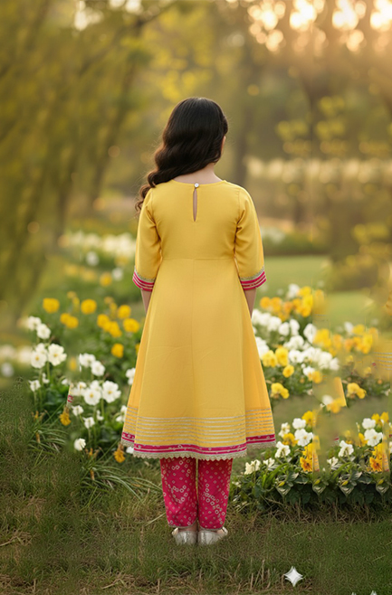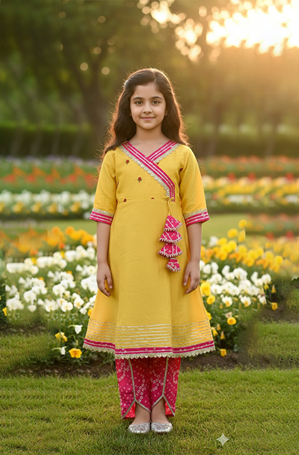 Girl’s Mustard & Fuchsia Angrakha Kurti Set