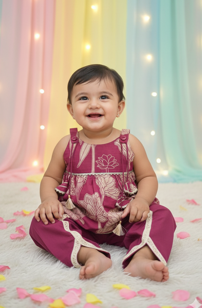 This Cherry kurti and dhoti set for infant girls is made from soft cotton 60×60 fabric for all-day comfort. The simple design allows easy movement and feels light on the skin. It works well for everyday wear as well as family gatherings.