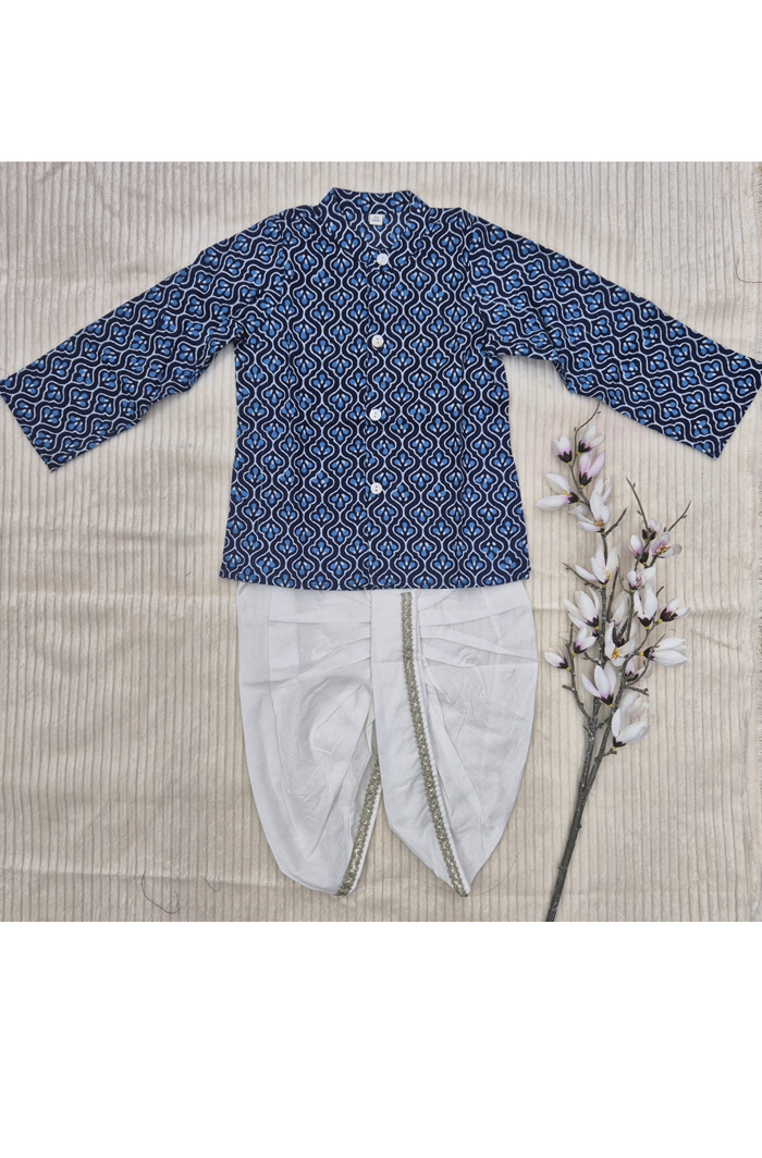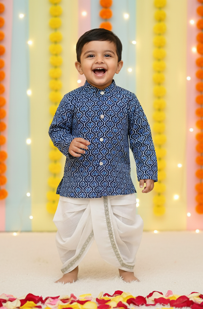 This adorable Dark Blue cotton kurta set is perfect for your little one, designed for boys aged 6-12 months or 1-2 years. Made from high-quality Cotton 60*60 fabric, this set provides both comfort and style. Ideal for festive occasions, family gatherings, or casual wear, it ensures a soft, breathable experience for your child throughout the day. The kurta is paired with matching white pants, creating a stylish traditional look for any event.