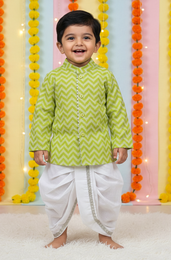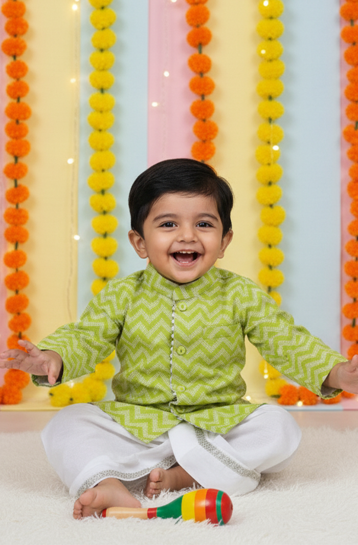 Designed for comfort and ease, this Green infant kurta and dhoti set is ideal for everyday wear. The front-open kurta with neat bijiya detailing makes dressing simple, especially for infants. Made from soft cotton 60×60 fabric, it feels light on the skin and allows your baby to move freely. The matching dhoti completes the traditional look, making the set suitable for both regular use and special occasions.