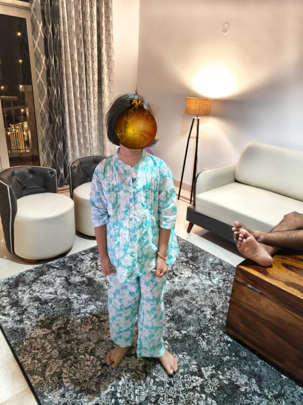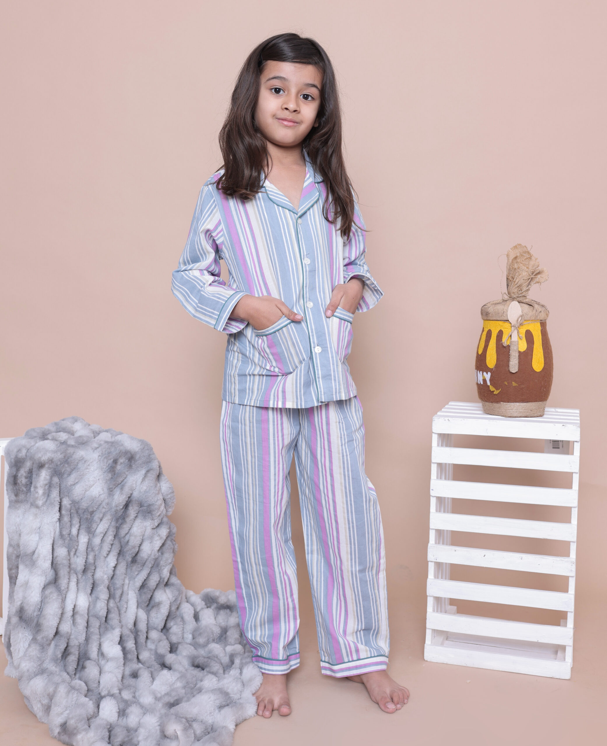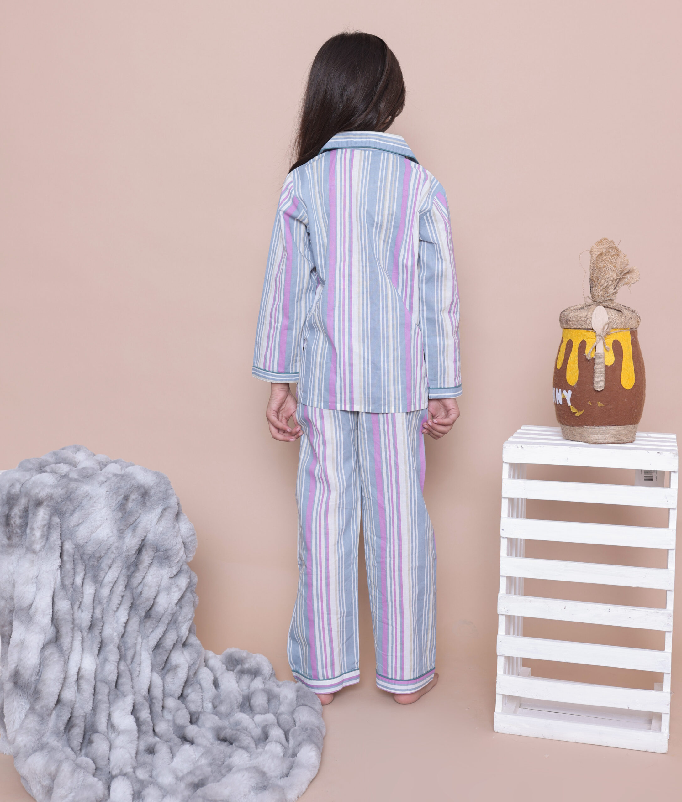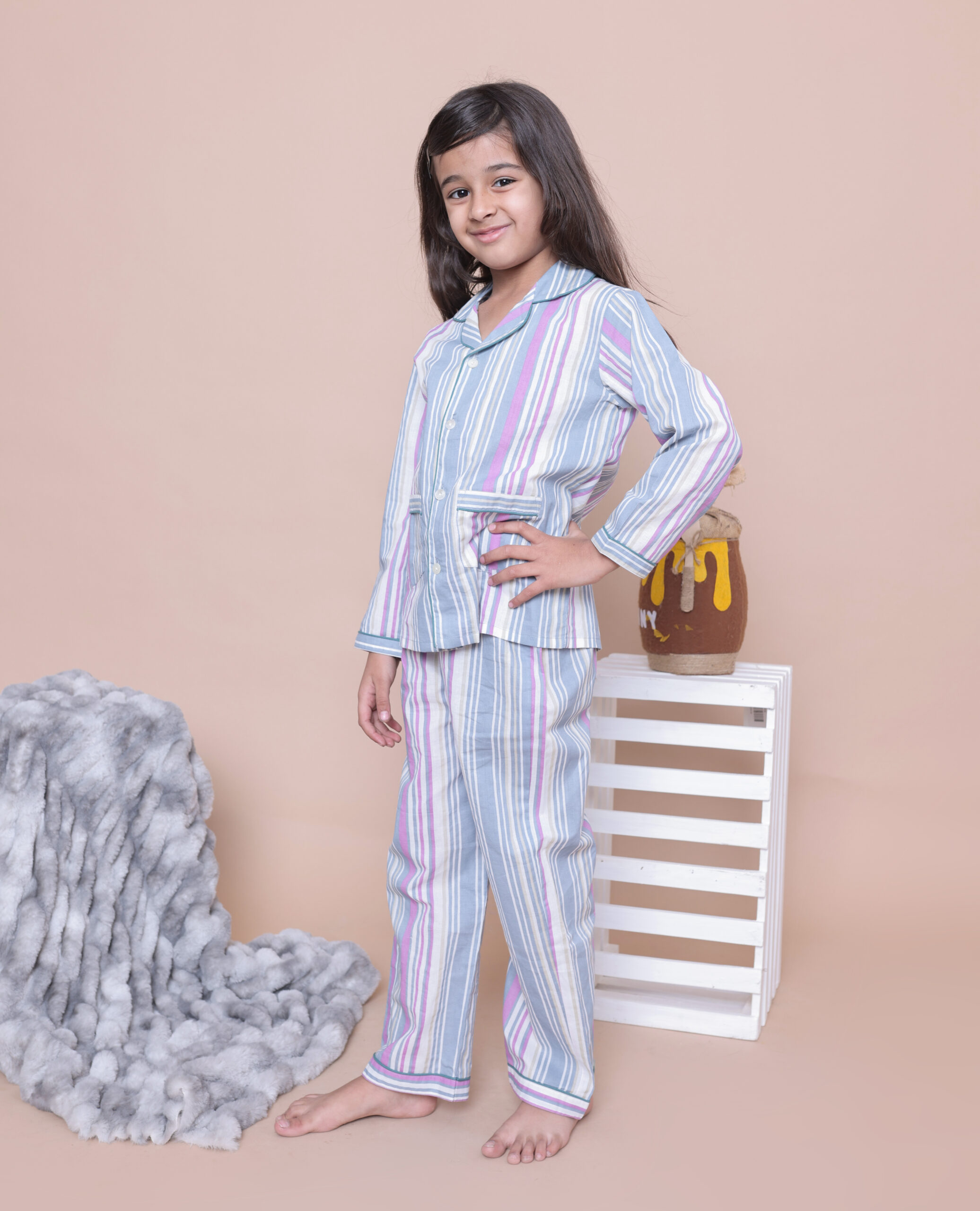 The Kids Cotton Striped Night Suit is a gorgeous and comfortable set. This two-piece set includes a full-sleeve button-down shirt and matching pajama pants with a soft vertical striped print in pastel colors. Made from 100% breathable cotton, it is ideal for nighttime, relaxation, and sleepovers.