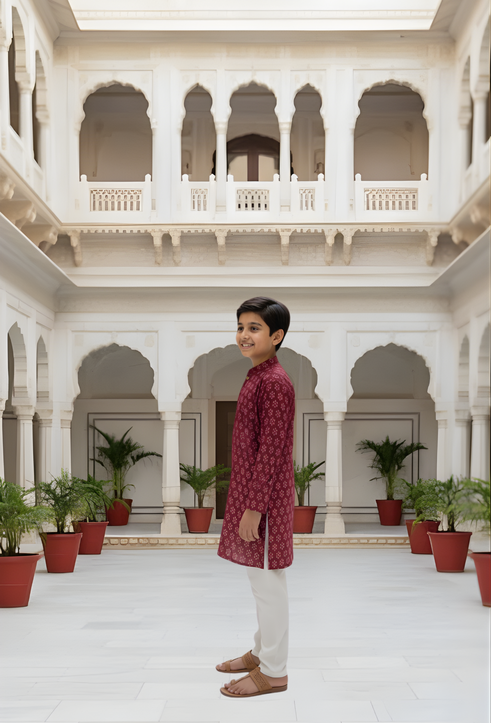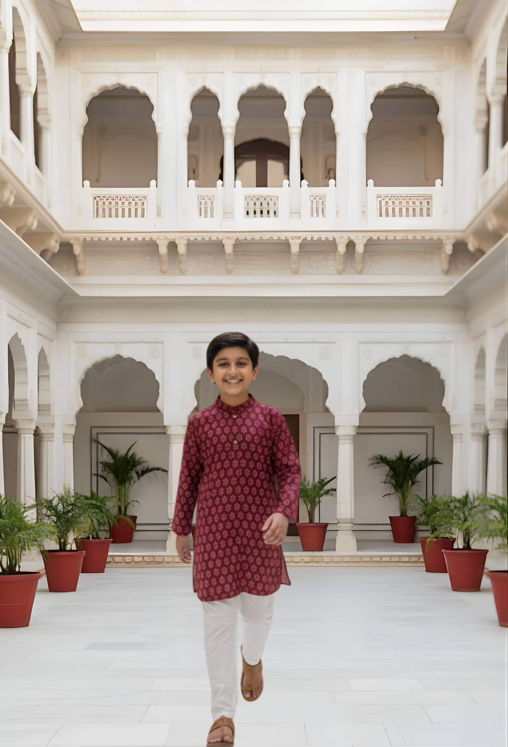This maroon kurta pajama set brings a neat, simple look for boys. The cotton fabric feels soft and light, making it comfortable to wear through the day during school events, festive occasions, or family gatherings. The plain maroon kurta with tidy stitching keeps the outfit clean and straightforward.