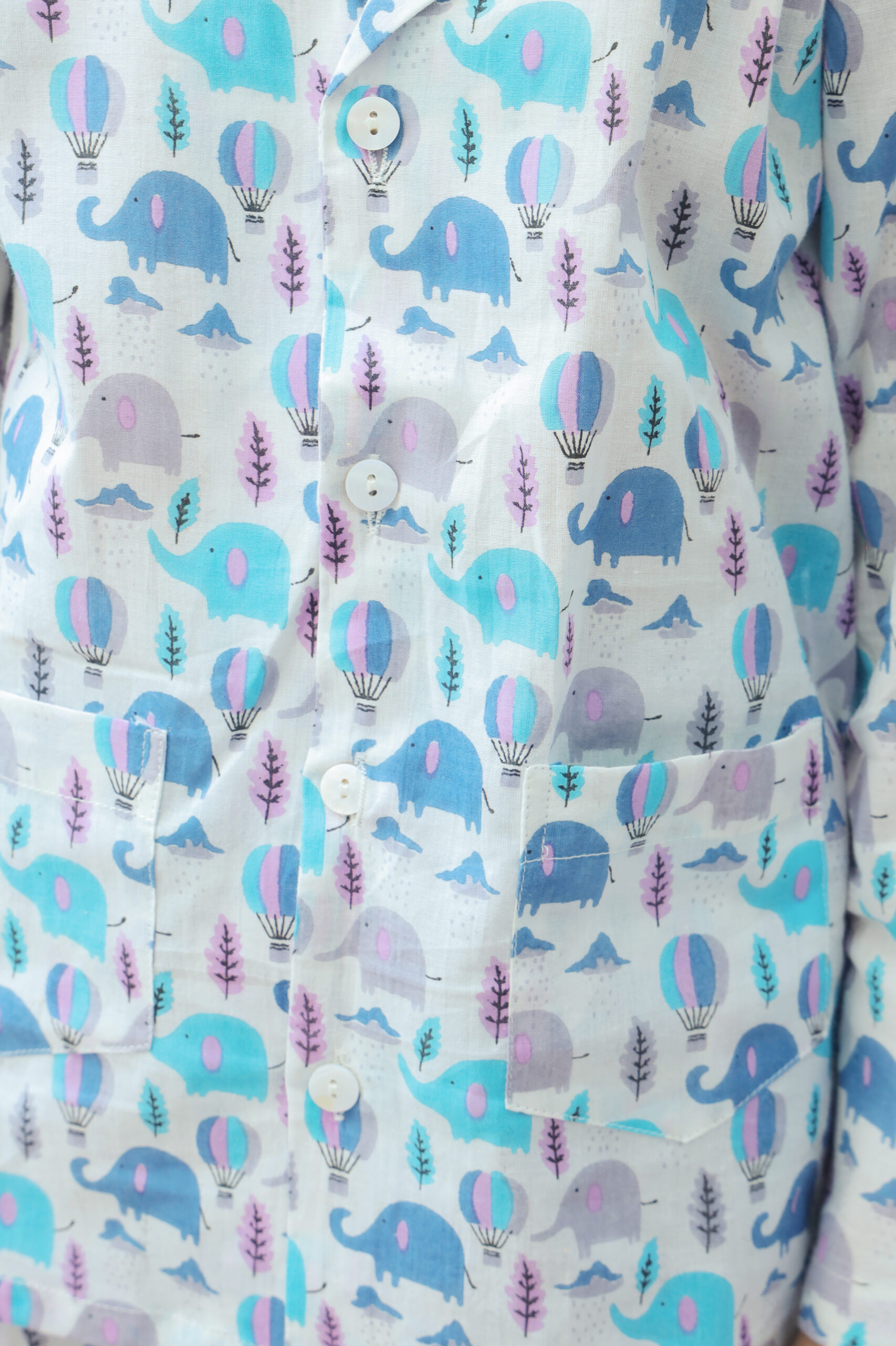 This Off-White Blue Night Suit features a full-sleeve shirt with a front pocket and matching pajama bottoms, all made from soft, breathable cotton. It provides the perfect blend of comfort and style, and the colorful print adds a playful touch, keeping your child cozy and stylish for bedtime.