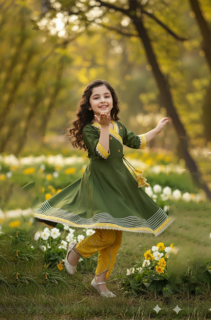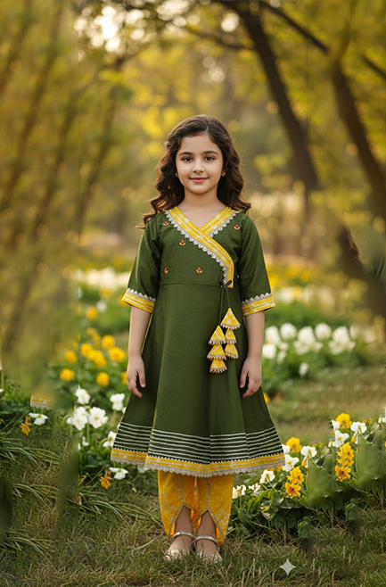 Girl’s Peacock Green & Yellow Angrakha Kurti Pant Set