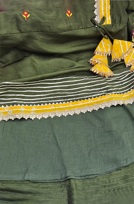 Offer your baby’s girl a classic and appealing look with this peacock green and yellow Angrakha kurti set. It feels nice and cosy on the skin as the material is made of silky cotton with a smooth cotton mulmul lining. The ensemble comes with matching bottoms that fit loosely, producing an easy, beautiful attire great for festivals, weddings and family gatherings.