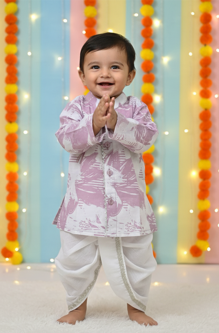 This beautiful purple baby kurta and dhoti set is comfortable for daily use. The front-open kurta with simple bijiya detailing makes dressing easy. Made from soft cotton 60×60 material, it feels gentle on sensitive skin and allows easy movement throughout the day. The matching dhoti completes the traditional look, making it suitable for everyday wear and special occasions.