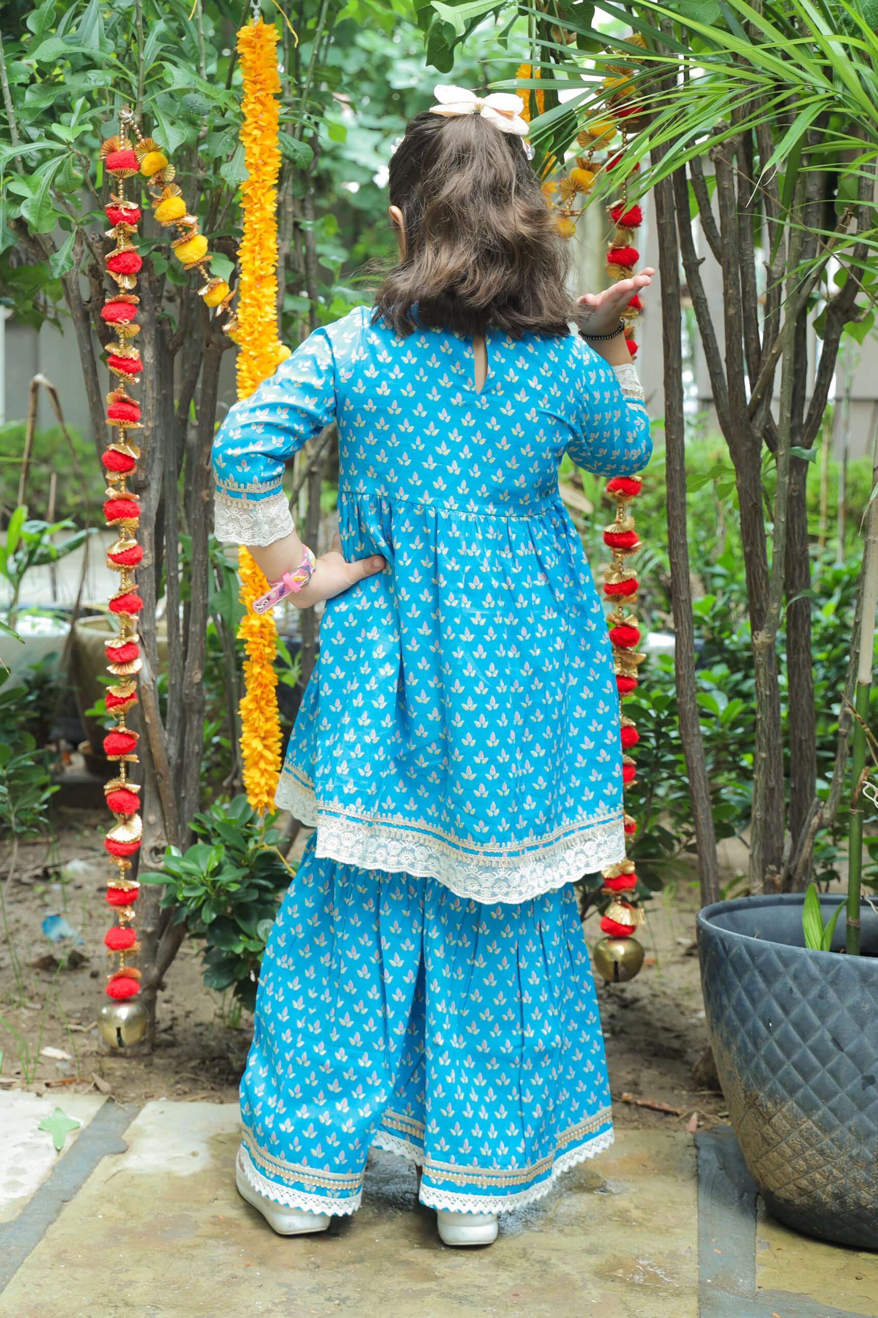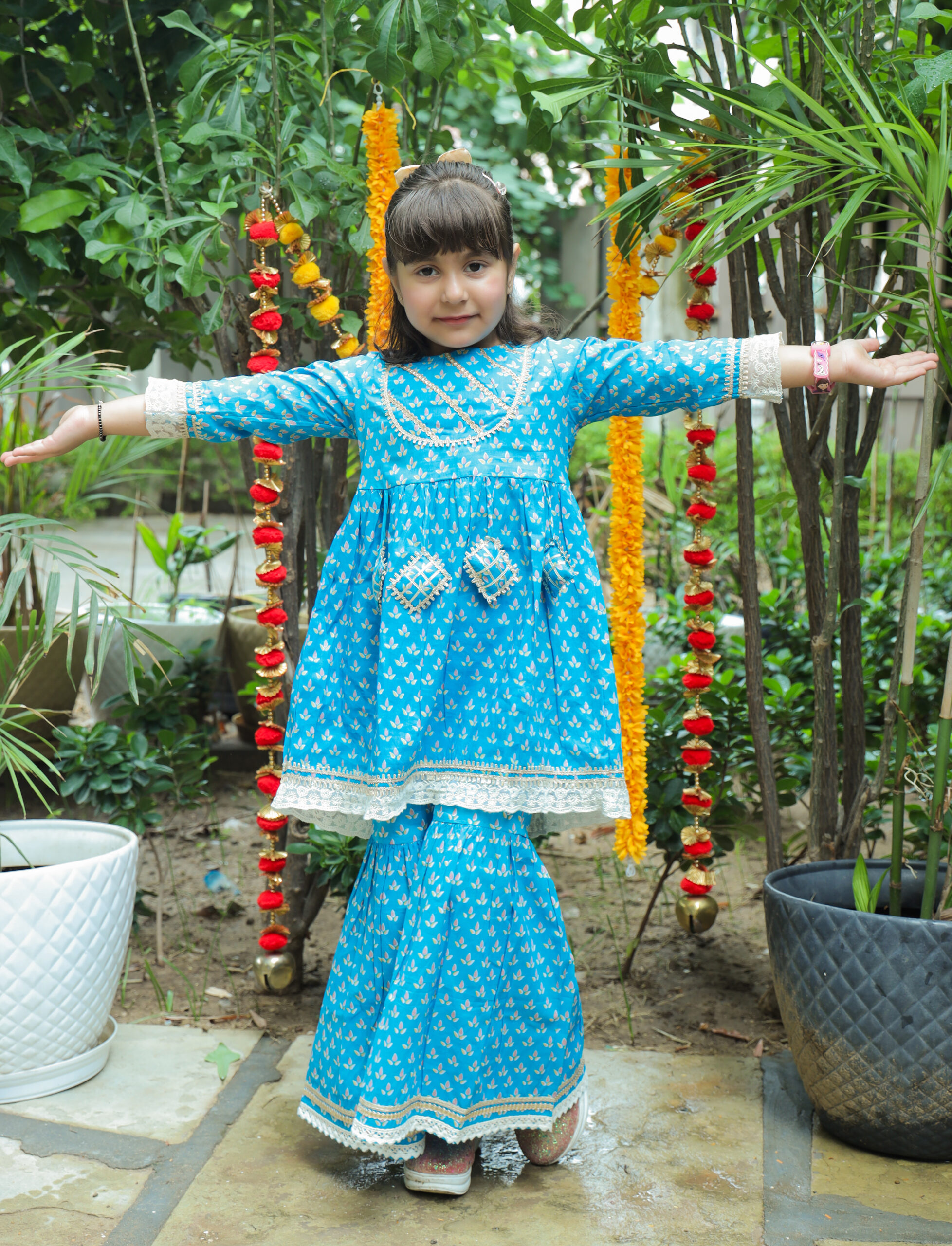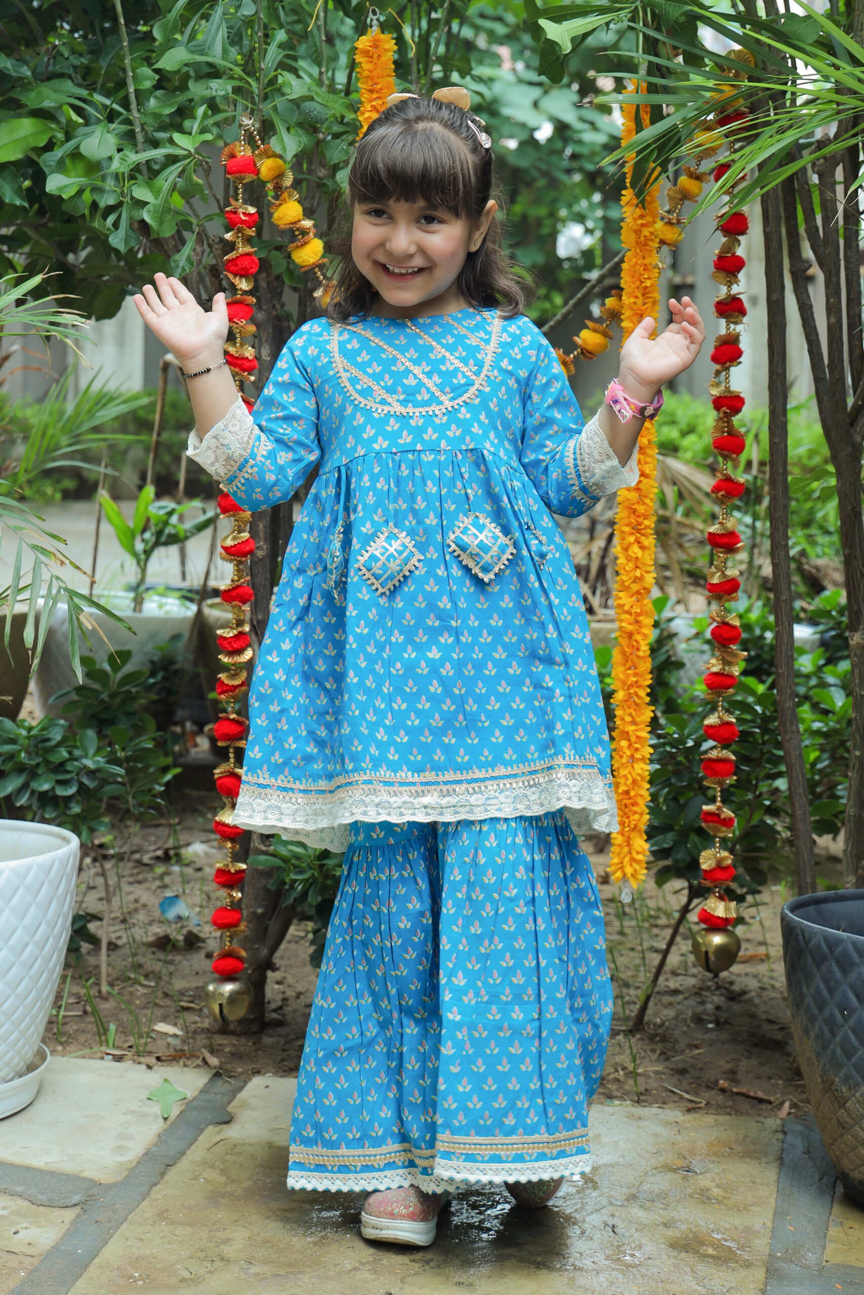 Let your little princess shine bright in this gorgeous blue ethnic sharara set. Crafted from soft and breathable cotton fabric, this outfit ensures maximum comfort while keeping her festive-ready. The beautifully printed A-line kurta is adorned with delicate gota lace detailing and playful latkans, paired with a flared sharara bottom that adds charm to her traditional look.